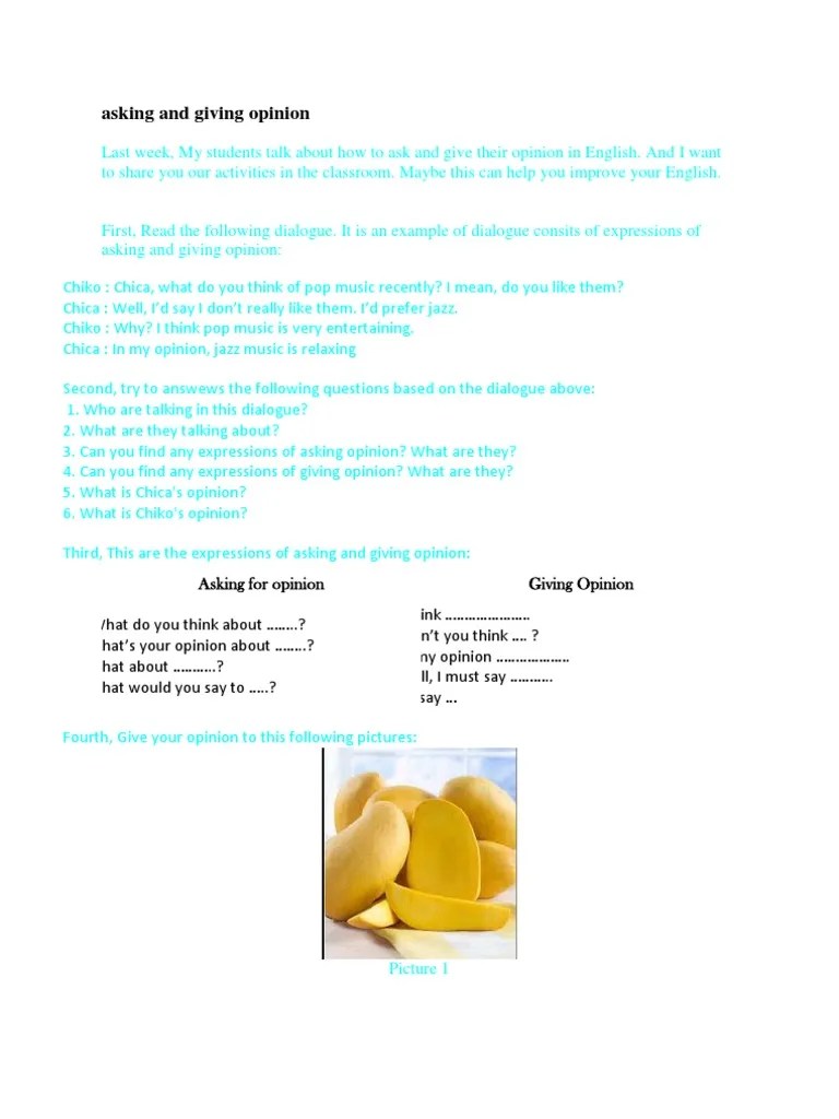 Hal ini dapat dilihat pada contoh percakapan tentang . Kamu lagi nyari contoh dialog asking dan giving opinion dalam bahasa inggris? Atau dialog bahasa inggris tentang asking for and giving opinion juga. Home > exercise > contoh percakapan asking and giving opinion 2 orang beserta artinya advertisement. Jika menggunakan bahasa indonesia mungkin kamu tidak akan merasa .