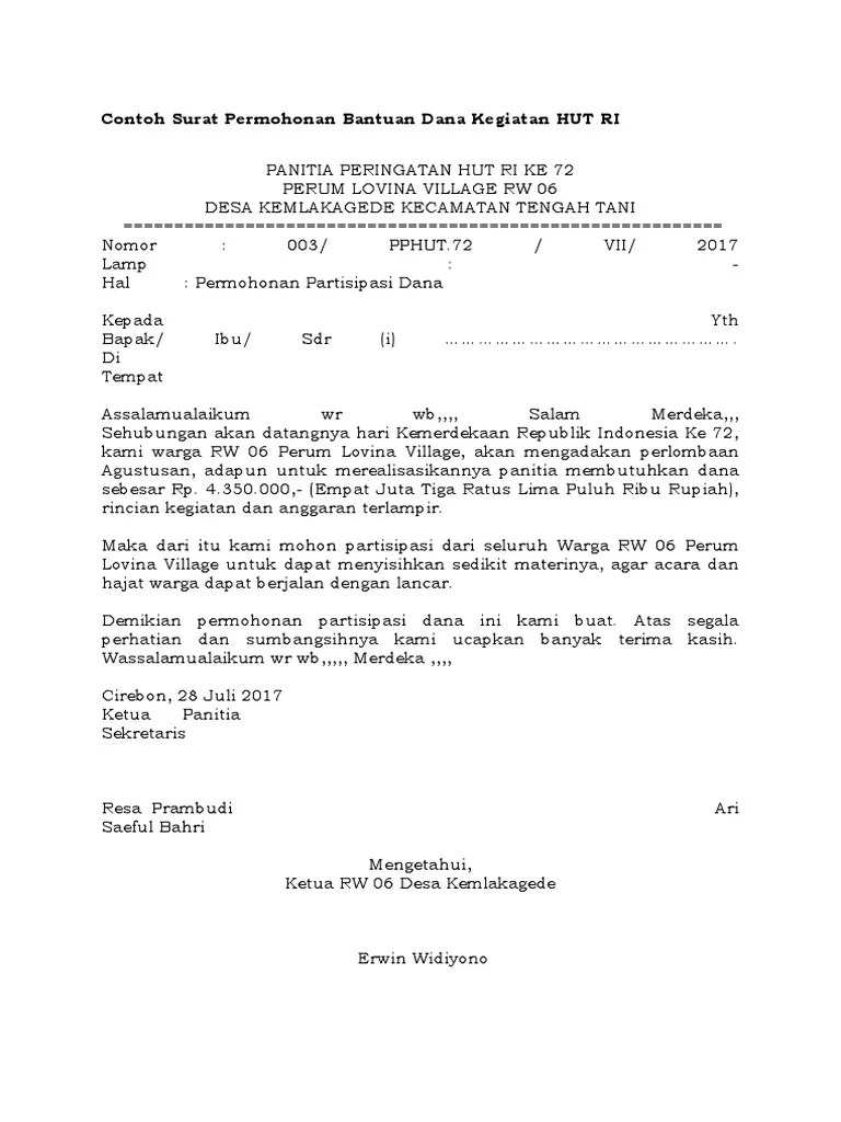 Contoh surat permohonan bantuan dana dan proposal kegiatan hut ri, . Tidak hanya sebagai sarana pengajuan dana, tujuan dari penyusunan proposal kegiatan juga untuk memperoleh persetujuan dari berbagai pihak . Terkadang dalam pembangunannya membutuhkan pengajuan dana kepada pihak pemerintah terkait. Umumnya proposal kegiatan acara digunakan apabila ingin mengajukan suatu permohonan seperti permohonan dana atau sponsor (dukungan) saat . Contoh proposal pembangunan masjid berikut ini akan . Total rencana anggaran biaya (rab) lomba 17 agustus dan jalan santai. Tema dari kegiatan lomba pbb tingkat smp/mts dan sma/smk/ma sederajat adalah "menumbuhkan semangat kebangsaan, patriotisme dan cinta tanah air melalui . Di bawah ini merupakan proposal untuk kegiatan sekolah yang hampir sama dengan contoh proposal dana kegiatan lomba. Dengan demikian, kami berinisiatif untuk mewujudkannya dalam ajang lomba debat dan pidato kepemudaan jilid i. Proposal sponsor untuk lomba cerdas cermat . Seperti misalnya contoh proposal pengajuan dana seperti berikut. Di bagian ini disebutkan siapa saja panitia yang bertanggung jawab atas pelaksanaan kegiatan. Disamping itu juga pembuatan proposal kegiatan berguna untuk mengajukan suatu permohonan dana, sponsor serta untuk mengurus perizinan suatu kegiatan.